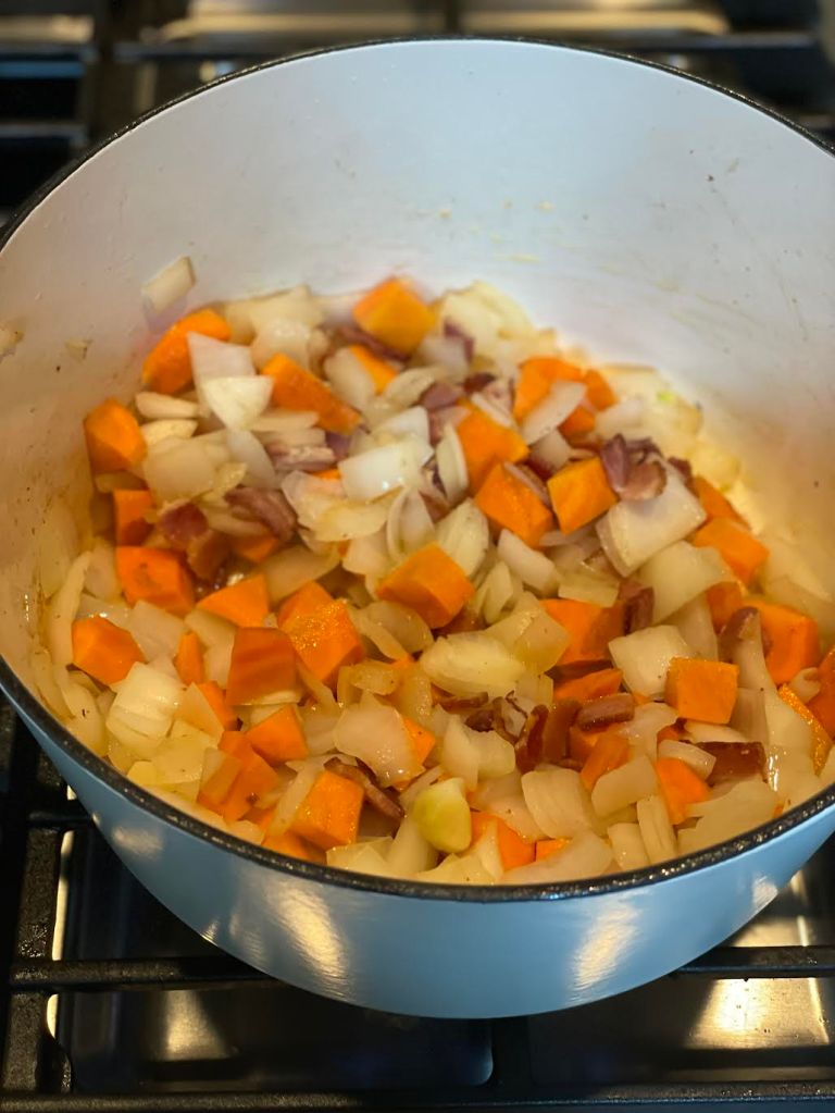 In the same dutch oven that you cooked the bacon (and the beef, if you didn’t use the grill) add your sliced carrots and onions and sauté until browned, about 5 minutes. Drain excess fat.