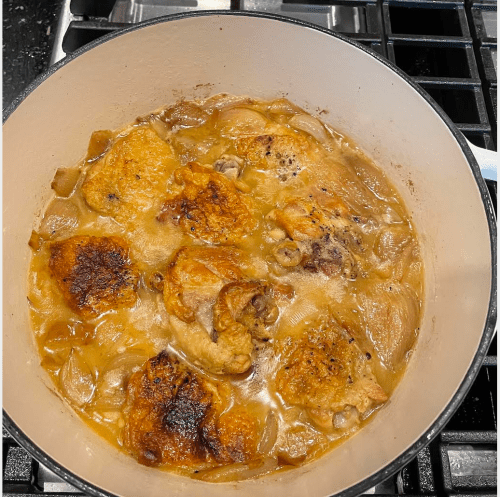 Add the chicken back in, bone side down. Turn heat down to a simmer, cover with a tight fitting lid and cook for 30 to 35 minutes or until chicken is cooked through.