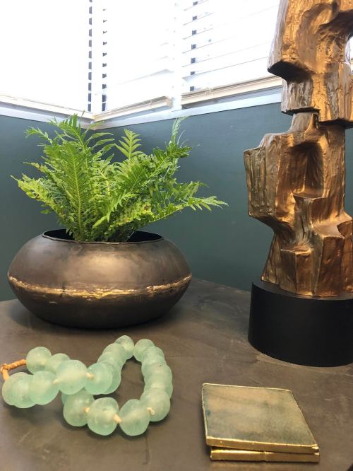 I wanted to bring organic elements into the room, so we used natural toned, roman shades to filter the light nicely. We also chose sustainable organic linens for the bed, used a soft rug, and added a wooden planter and greenery throughout. I included some smaller images below to show the accessories we used.