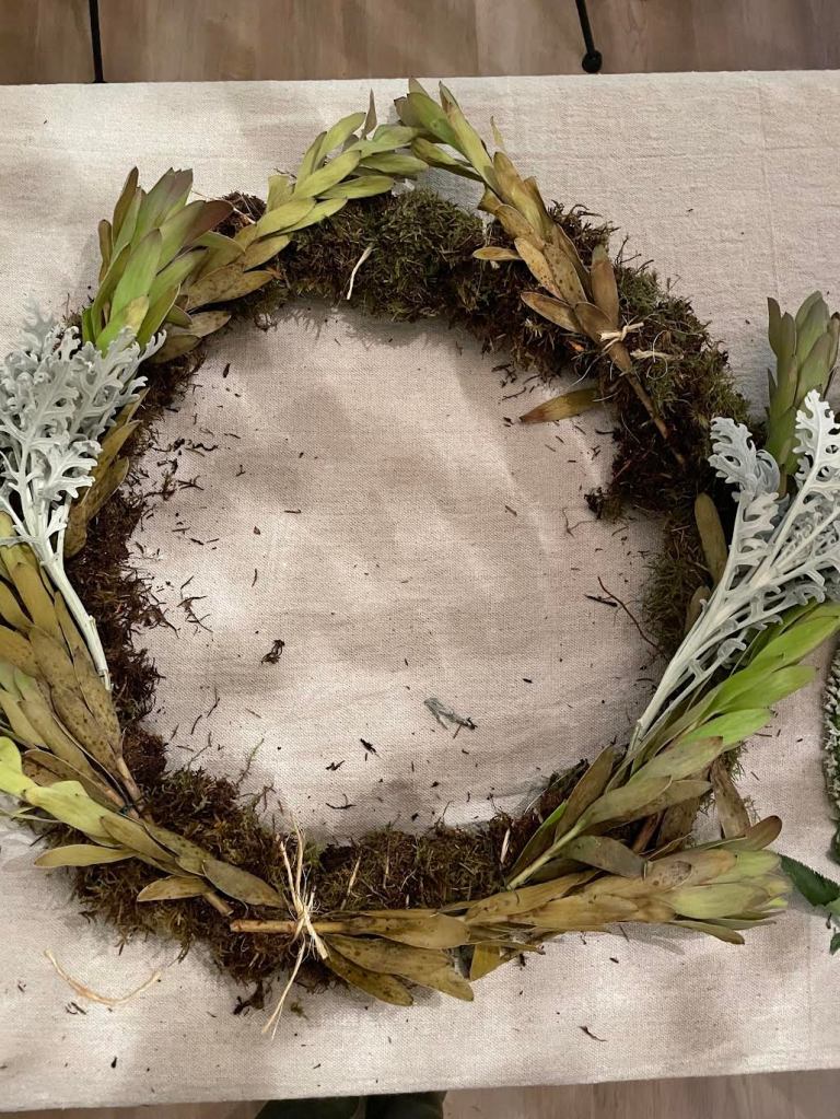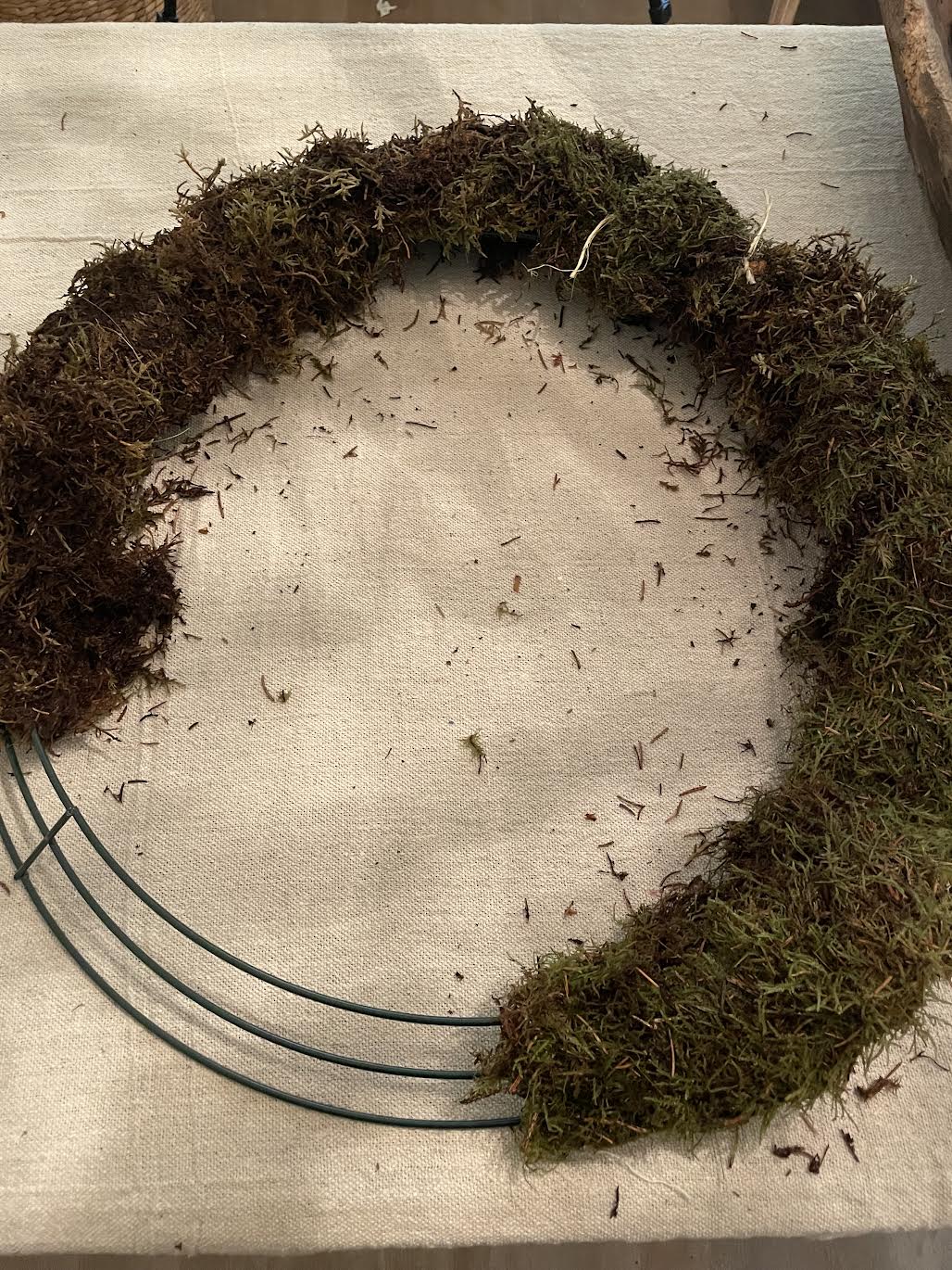 I wrapped the entire wreath in moss and then tied it with twine to secure it to the wreath frame.
