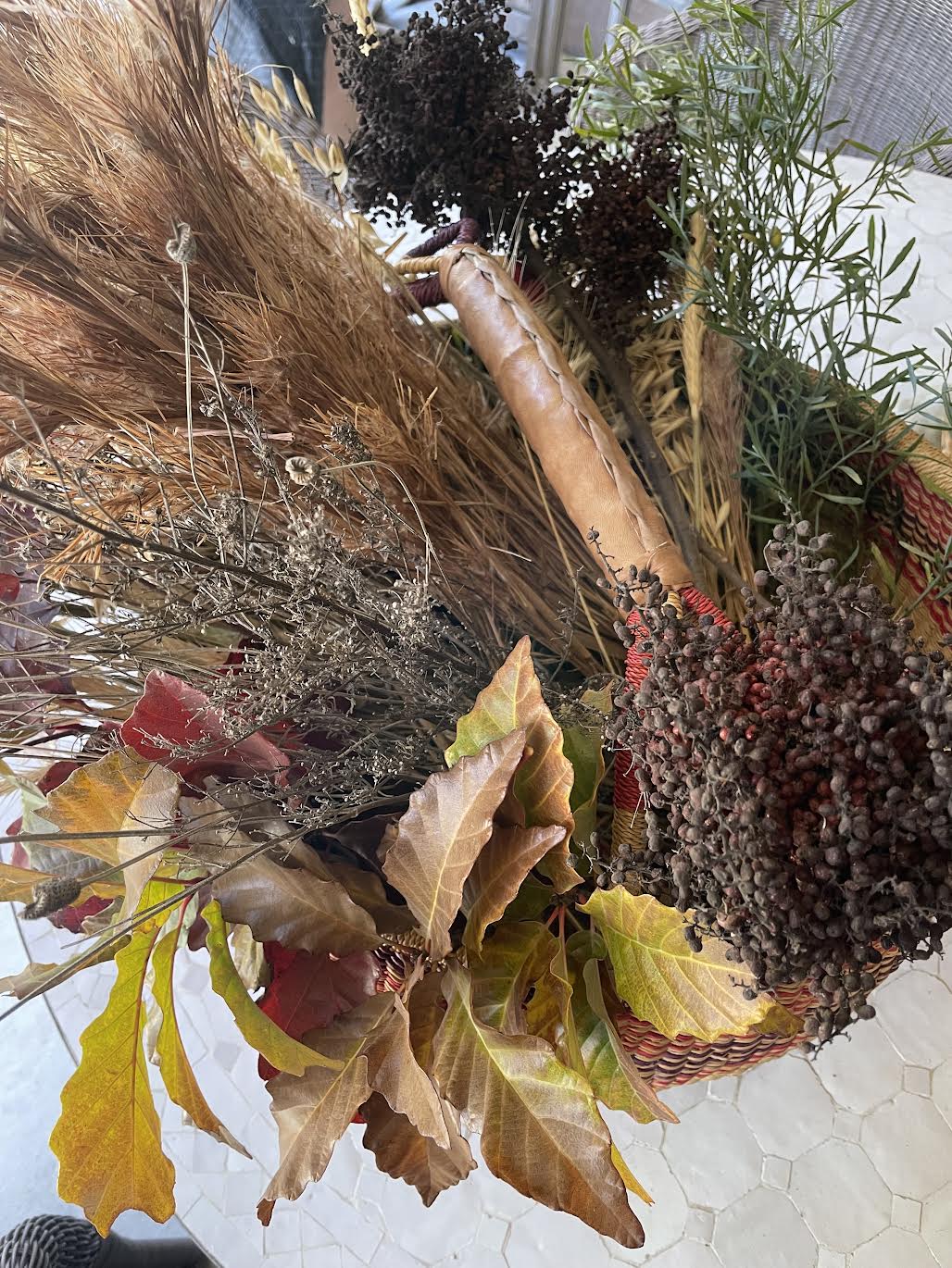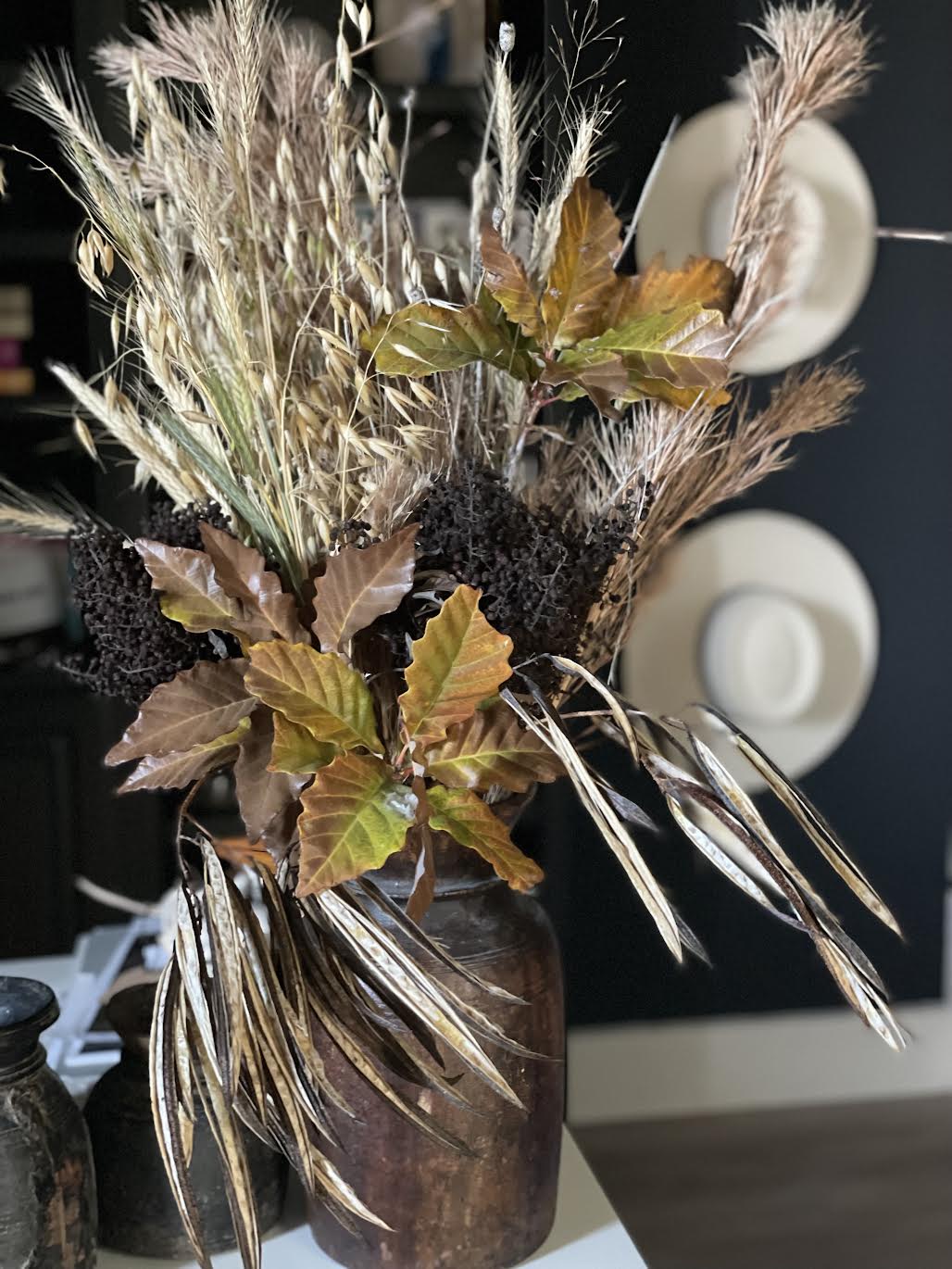 I found that I really loved the color of the dusty miller (gray plant), the movement of the eucalyptus and if I’m being honest, the texture of the crape myrtle seed pods warms my heart.