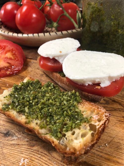 Spread the pesto on both sides of baguette. Add the sliced tomatoes, salt the tomatoes. Stack the sliced buffalo mozzarella on top and add a little salt to the mozzarella. If you don’t have pesto then you can use a good olive oil.