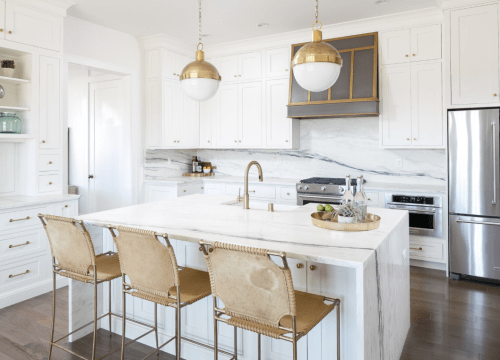 Love this gorgeous kitchen from Leslie Cotter Interiors. Although, the overall palette is quite simple she added understated elegance with a gorgeous range hood, pendants, and bar stools.