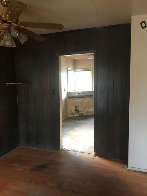 Above, we completely gutted the kitchen so I can now determine the layout. I’m leaning towards eliminating the two smaller windows in the left corner and replacing them with a large window on the back wall to allow for more light and a view of the backyard.
