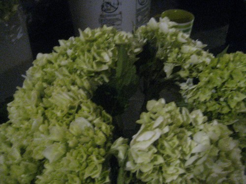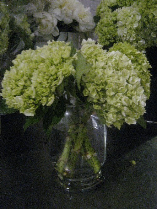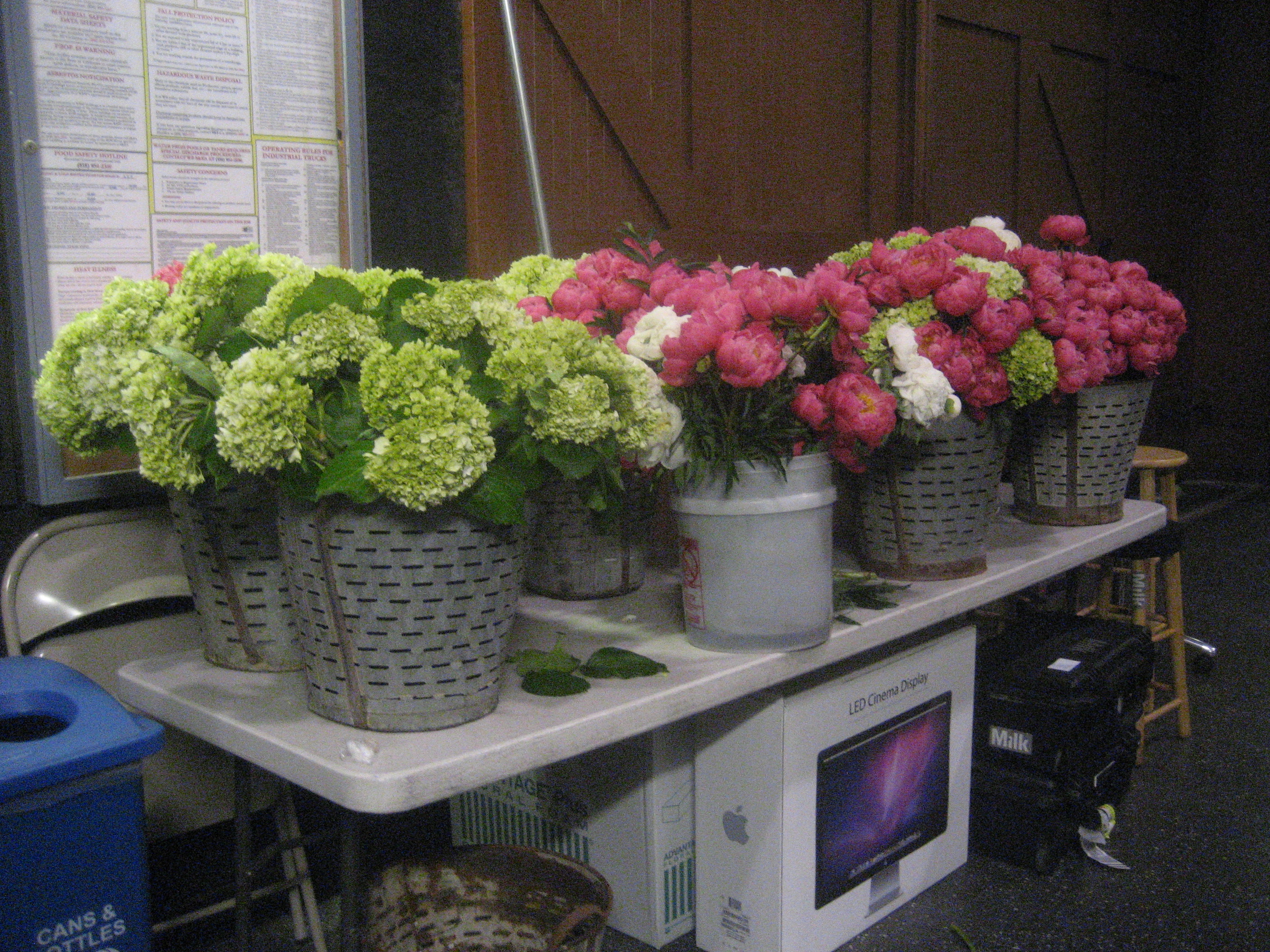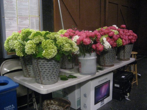 Above, the hydrangeas and peonies. Even the way Cathy has them arranged — waiting to be arranged – is gorgeous (the antique olive buckets are from Big Daddy’s).