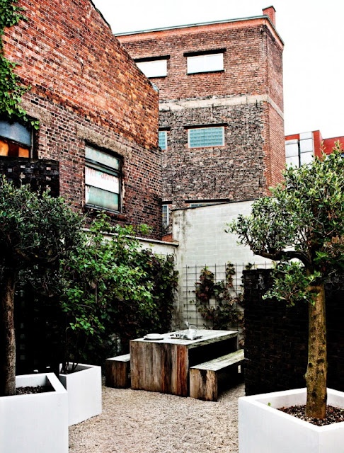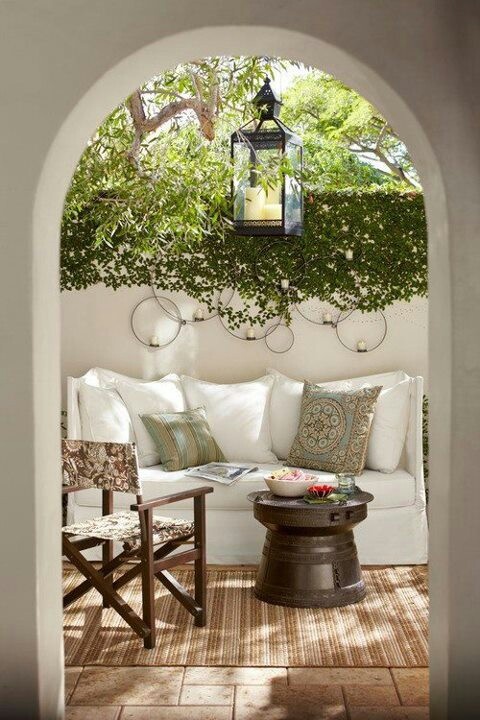 The picture above, of a very small courtyard, is a great example of using a small space wisely. The fig ivy on the wall for a bit of green, candles for ambiance, a love seat and chair for a conversational area, and a small table to place a book or beverage on. Perfect!