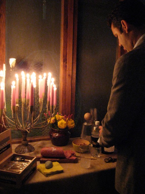 The party took place at a friend’s house–a wonderful Tudor style home perched on a small hill in a very cute neighborhood. Candles placed in silver tins lined the pathway leading to the garden and the faint sound of jazz could be heard as you passed through the garden gates.