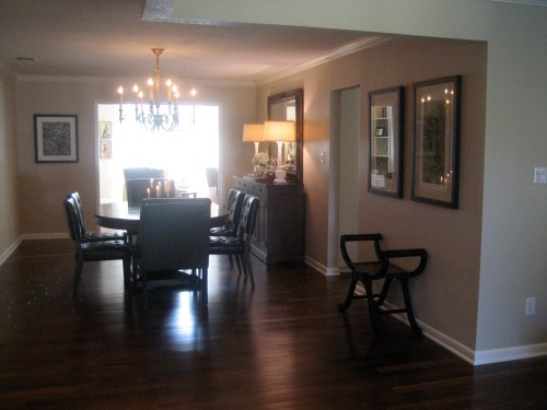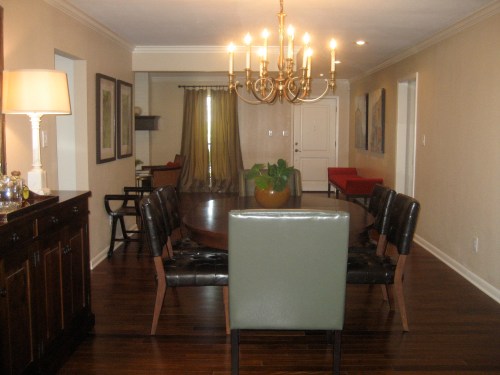 Again, you can see with the removal of the atrium, the space is more open. For functional purposes, as well as to incorporate color, we placed a 9 foot red bench in the entry. The owners are still waiting for the 10 foot dining room table and a piece of art that will be placed on the wall opposite the buffet. The chandelier is from Hinkley Lighting.