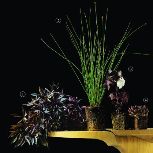 (1) Ornamental Sweet Potato Vine, (2) Small Cape Rush, (3) Black Cotton, (4) Hens & Chicks