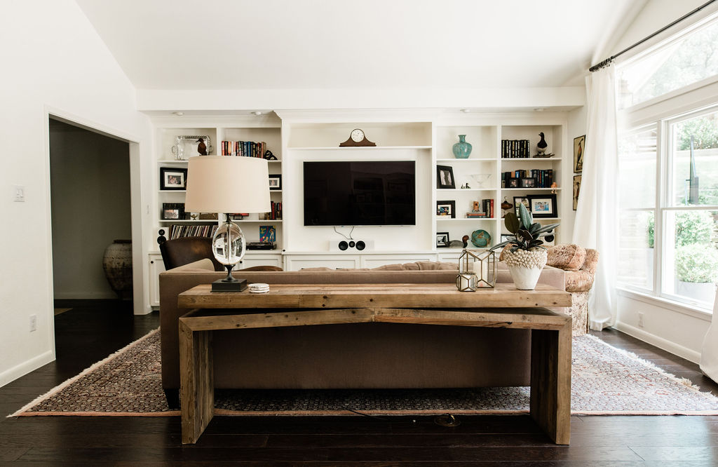 The plan, with the living area (above), was to beef up the built-ins by removing the closet on the left. We also wanted to simplify the look of the built-ins by having only shelves on top and keeping only drawers at the bottom (see below).