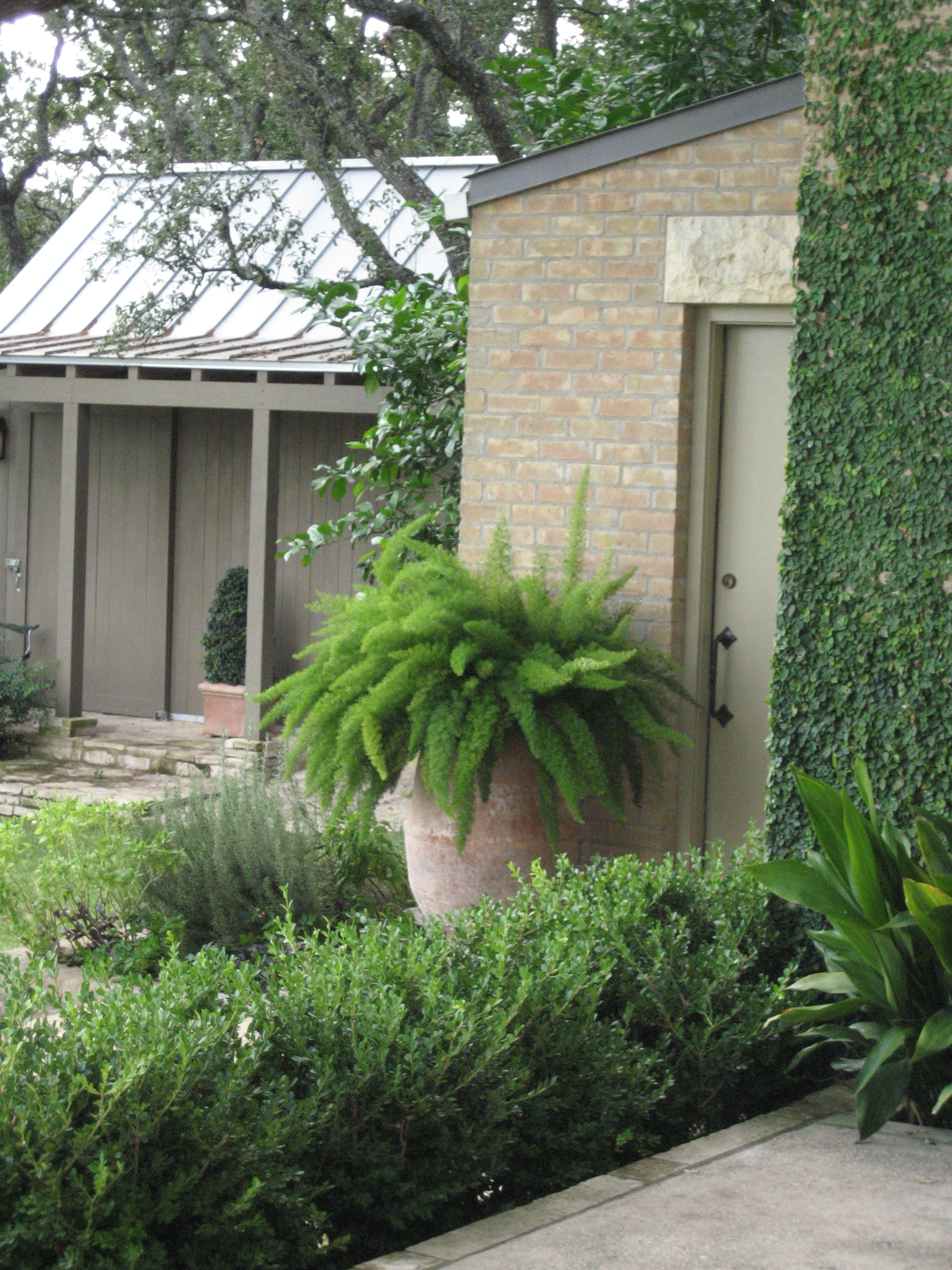 This was a wonderful project to work on! Not only was this project for a dear friend and fellow designer, Lisa Woolley, but this home had so many unique and charming elements that it really made the project an exciting one to do. Built in 1940, the home was originally designed as the “mother-in-law” home to the house next-door. Initially, the house had two entrances, one on either side of the home. A main design goal was to direct guests to the now principal entrance which was through the courtyard to the left. When I first saw the home, it really seemed to have an Old World charm about it so I decided to continue the theme. I used a lot of shrubs that could be shaped into conical and rounded shapes as the garden matured and chose shutters that were reminiscent of a home in the European countryside.