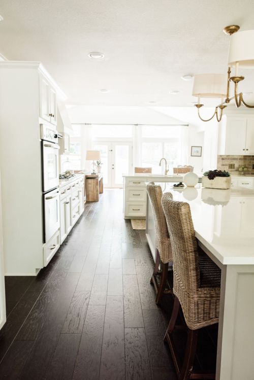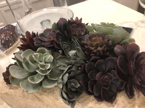 This is a beautiful, yet simple, way to add something extra to your kitchen island, entry or dining area. For this client’s home, I went with this handsome limestone planter and selected mainly purple and gray succulents that would complement the color tones in her kitchen. Below, you can see how easy it is to put an arrangement like this together.